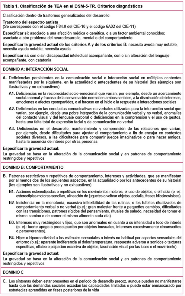 A continuación, en la Tabla 1 se expone la clasificación de TEA descrita en el DSM‑5‑TR, así como una descripción de los síntomas correspondientes a los dominios o áreas que son considerados para el diagnóstico. Las características clínicas individuales se identifican a través de especificadores, que permiten individualizar el diagnóstico y realizar una descripción clínica más detallada de los individuos detectados.