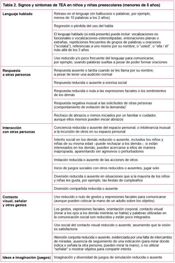 El TEA es un trastorno del neurodesarrollo definido como un «espectro» en el DSM‑5, debido a variaciones en su presentación clínica relacionadas con la gravedad, el nivel de desarrollo y la edad cronológica. Incluye varios subtipos previamente definidos en DSM‑IV (trastorno autista, trastorno de Asperger, trastorno desintegrativo infantil y trastorno generalizado del desarrollo no especificado) (6). Las características esenciales de TEA están agrupadas en 2 criterios, basados en la triada de Wing (43):