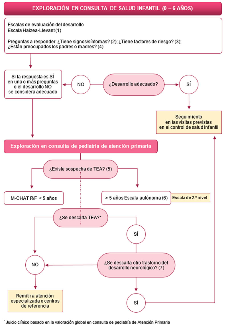 Los aspectos relacionados con el retraso en el diagnóstico de TEA ponen de relieve la importancia de la detección precoz de los signos de alerta para facilitar el diagnóstico preciso y a una edad temprana. El diagnóstico y seguimiento del TEA requiere la coordinación multidisciplinar de los equipos de Atención Primaria, Atención hospitalaria y unidades de Atención Temprana, con colaboración entre pediatría, neuropediatría, servicios de salud mental infanto-juvenil y otros servicios de atención especializada, para favorecer un proceso asistencial continuo entre equipos de diferentes niveles asistenciales. La familia está involucrada en el proceso de diagnóstico y seguimiento de los niños y niñas con TEA junto con los equipos profesionales sanitarios, para facilitar la detección y derivación, y el mayor beneficio posible para los niños y niñas con TEA. Una buena comunicación con los y las profesionales promueve la participación positiva de las familias en el proceso de diagnóstico y seguimiento de TEA (12). Asimismo, un diagnóstico precoz facilita el apoyo a las familias y el entendimiento del comportamiento del niño o niña, permite la derivación a servicios de diagnóstico, una apropiada intervención en el manejo del cuadro clínico, así como la integración a nivel social y educativo; el conjunto de intervenciones que se favorecen con el diagnóstico precoz tienden a reducir la morbilidad de los niños y niñas con autismo, mejoran los desenlaces de salud y es probable que conduzca a una mejor funcionalidad en la edad adulta (13,14).